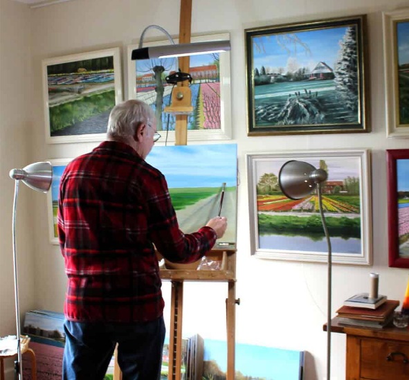 Naast het verzamelen van vazen met hyacinten, ben ik ook een fervent landschapsschilder, met name van de kleurrijke bloembollenvelden rond mijn geboorteplaats Hillegom. De prachtig bloeiende bollenvelden betoveren me telkens weer. In de loop der jaren zijn mijn schilderijen tentoongesteld op kunstbeurzen, in galerieën en musea.